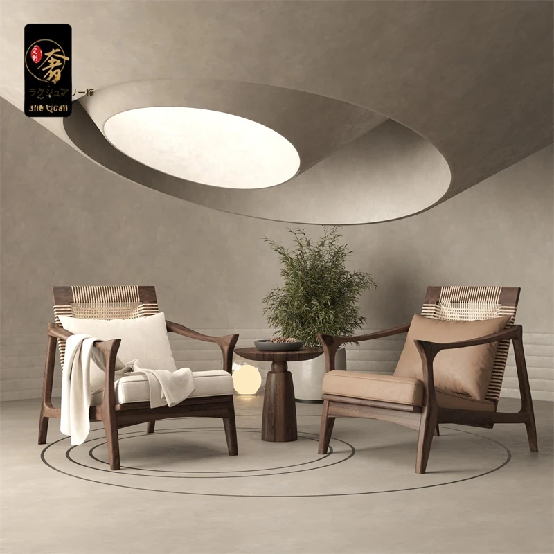 侘寂スタイルの無垢材とラタン編みの一人掛けソファ - リビングやバルコニーにぴったりなデザイナー製のヴィンテージ風リラックスチェア。心地よいひとときを演出します!