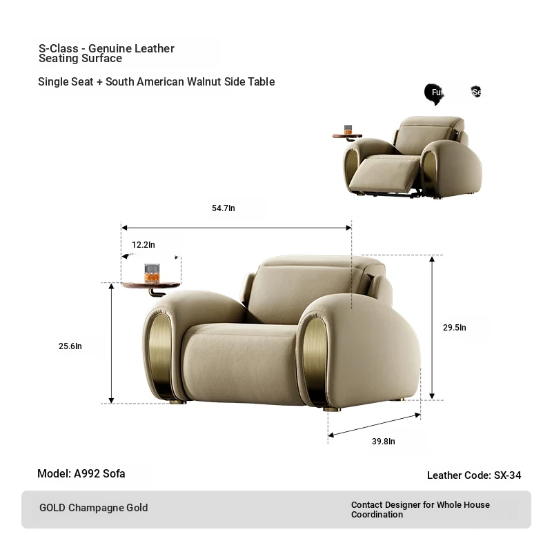 Film and television function sofa/single seat/South American walnut side table/S grade full leather