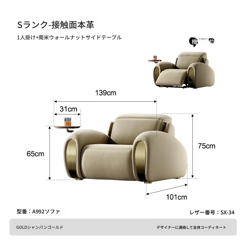 映画機能ソファ/一人用/南米クルミ木サイドテーブル/Sクラス全真皮革
