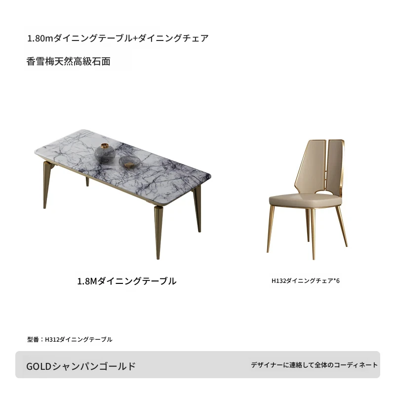 ダイニングテーブル/1.8M+H132超繊維レザーのダイニングチェア*6/香雪梅天然石/シャンパンゴールド