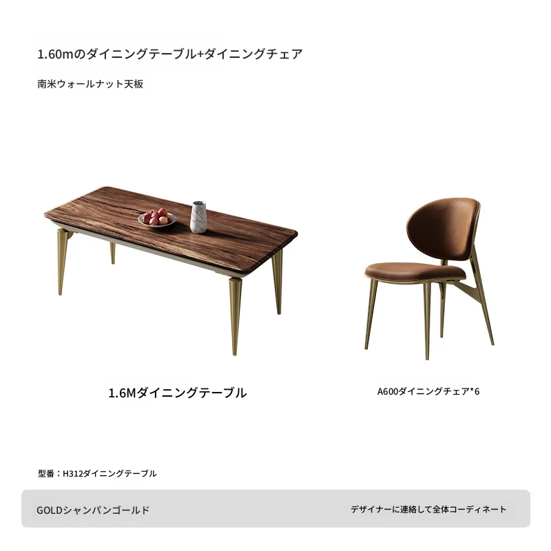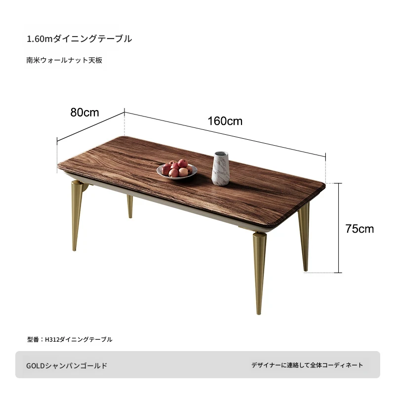 ダイニングテーブル/1.6M/南米クルミの木/シャンパンゴールド