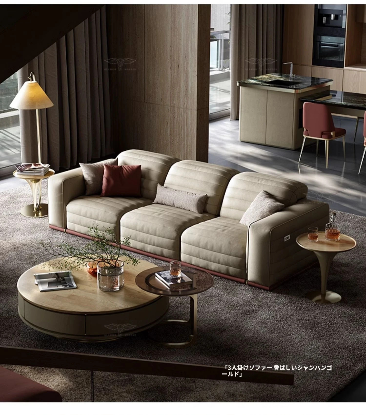 機能ソファ/三人掛け/S級本革/シャンパンゴールド