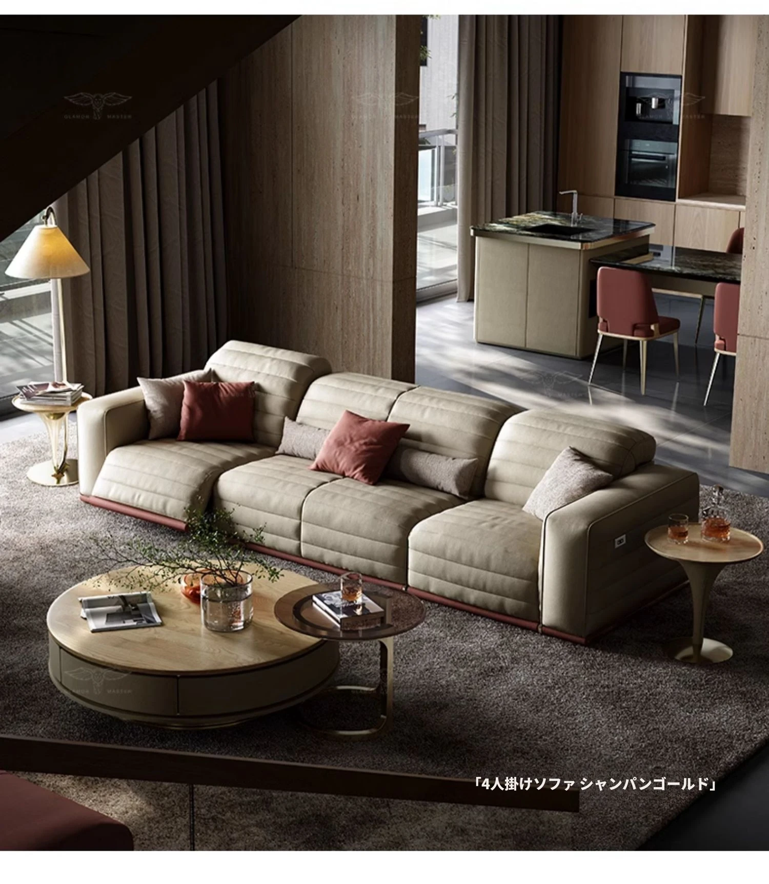機能ソファ/四人掛け/S級本革/シャンパンゴールド