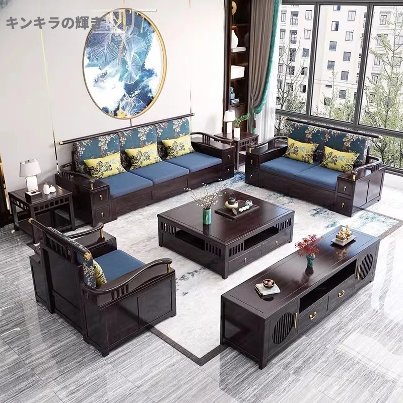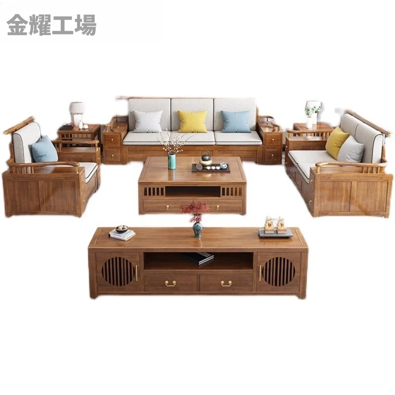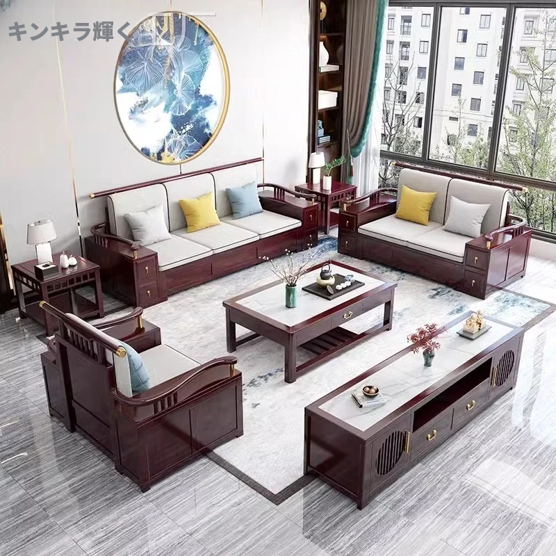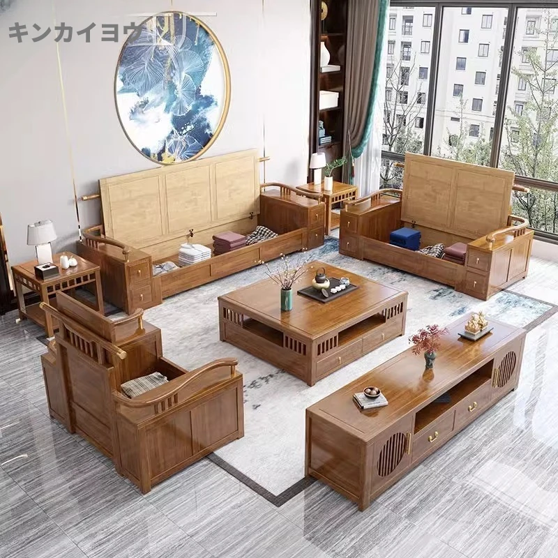 現代中式リビング用LY9908全実木製ソファ - 夏冬兼用、小型収納付き、上質な木材を使用したおしゃれなデザインで、限られたスペースにも最適!お部屋をスタイリッシュに演出します。